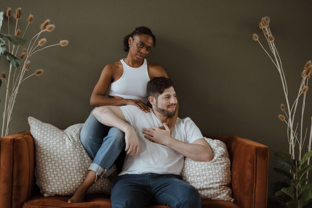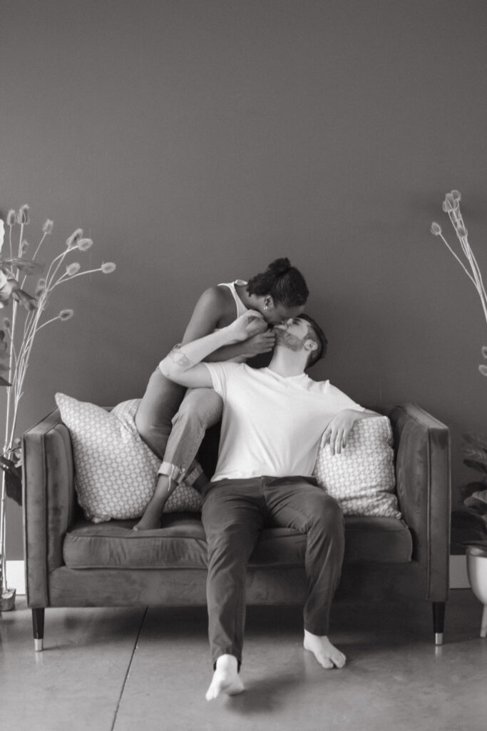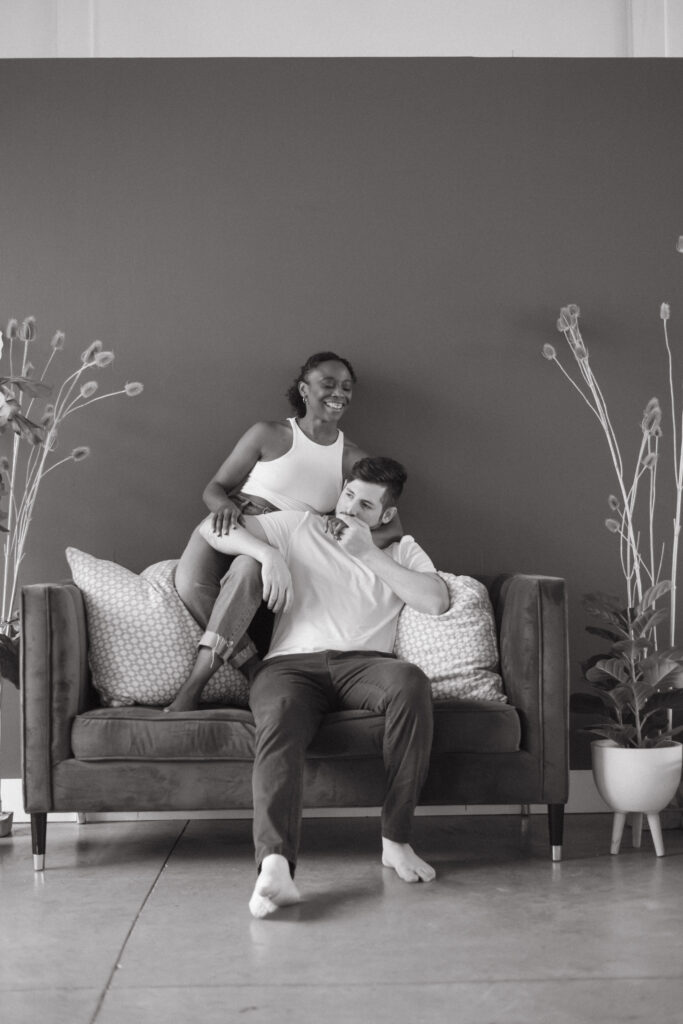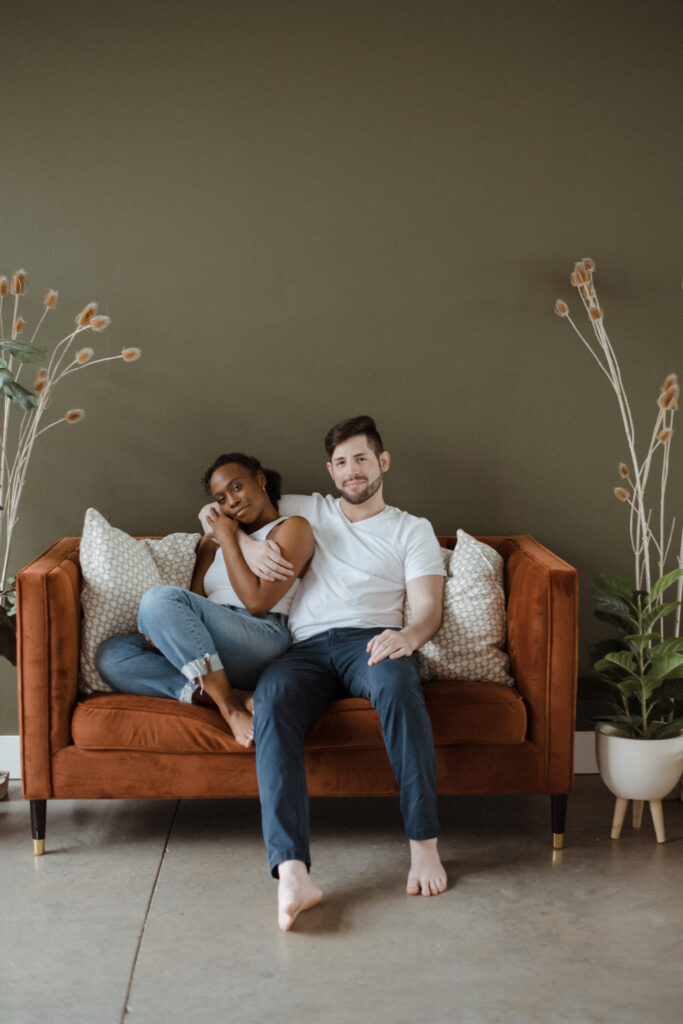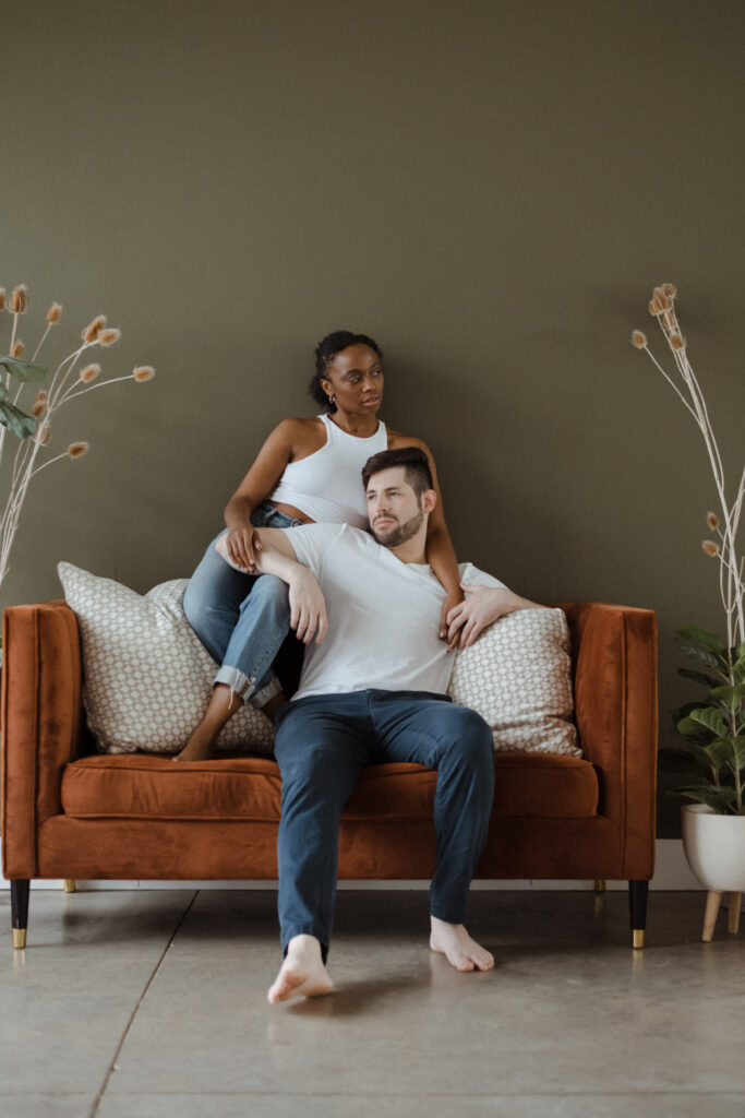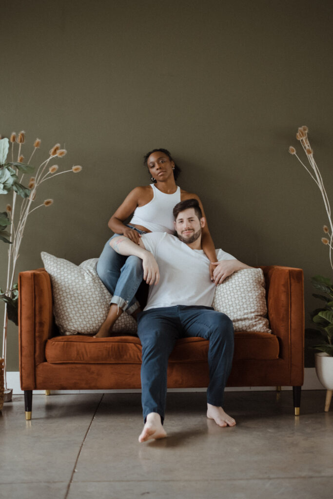 Couples studio sessions are such a great alternative to braving the cold during Colorado’s winter months. There’s so many amazing studio options along the front range! And most of them have rotating set designs to keep things fresh and fun. I personally enjoy the studios with great big windows for natural light. It’s a great way to get cozy and snuggly without worry about the weather outside. And it also is great for different times throughout the day, it truly doesn’t;t matter what time you do inside. This is great for families/newborns as well-as we know kiddos need to work around their nap schedules etc. Studios are a wonderful option for so many different schedules and style of portraits. I truly recommend considering them for any type of session!